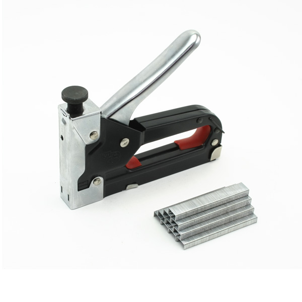コンプレッサーや電気を使わず、お手軽にどこでもシートの張替えが出来るバネタイプのシートタッカー。ダイヤルで打ち込む力を調整することも可能。手の力で打ち込みやすい線径0.7mmのタッカー針を1000本付属。(針のサイズ:11.3x0.7x6mm)
