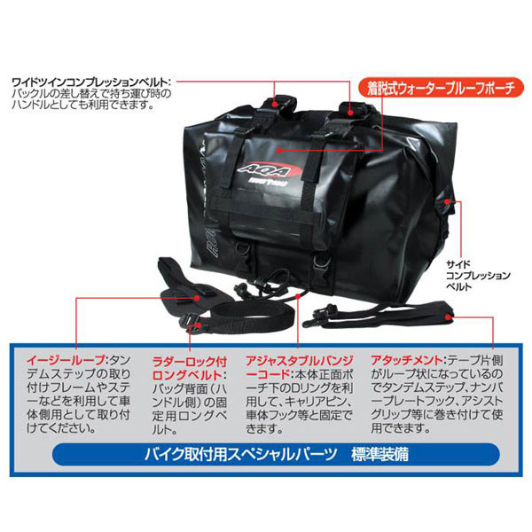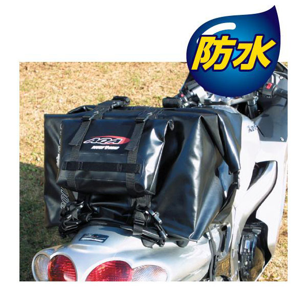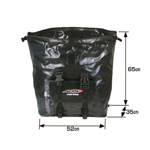 当社の 防水バッグ最大容量の75リットル。インナーに着脱式のプロテクションボックスを備えている上に、立て入れの上部開放型バッグなので積んだまま荷物の出し入れができ大変便利です。この大きさにもかかわらず豊富な取り付けベルトにより、確実な積載が可能になっているのも魅力的。