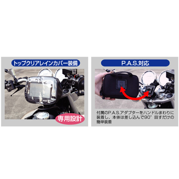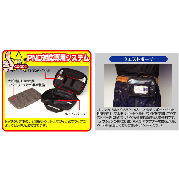 装着場所の自由度が高いP.A.S.アダプター対応のPND対応ポーチ。ポータブルナビ・アイホン・スマートフォン・ミュージックプレーヤーなどのガジェットが収納しやすい設計になっています。レインカバー標準装備でリーズナブルに使える万能ポーチです。