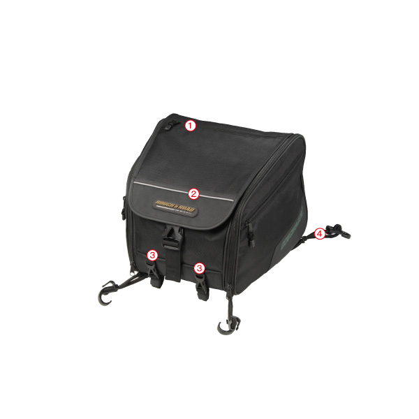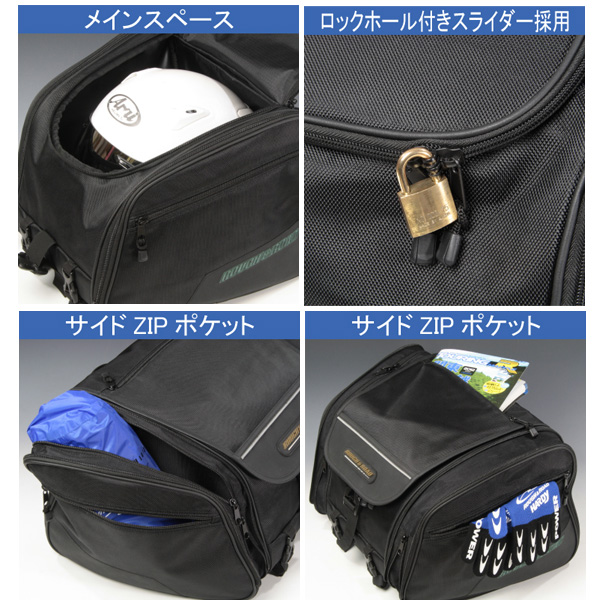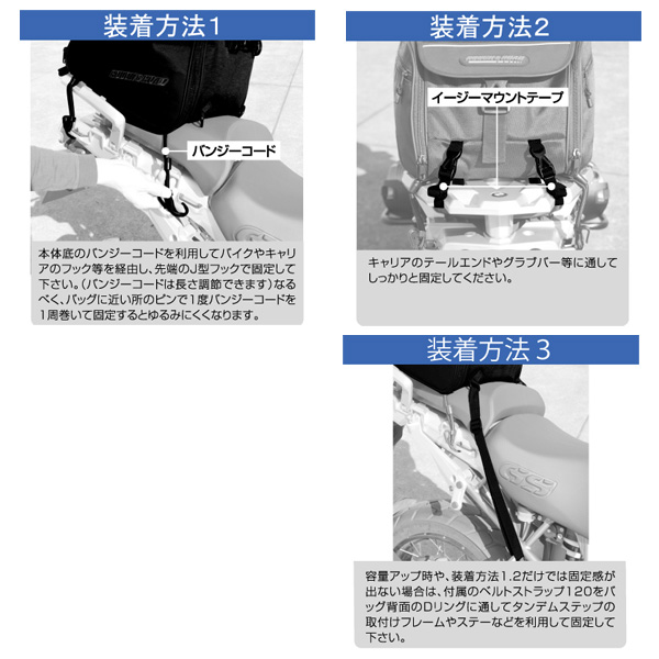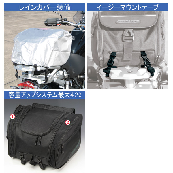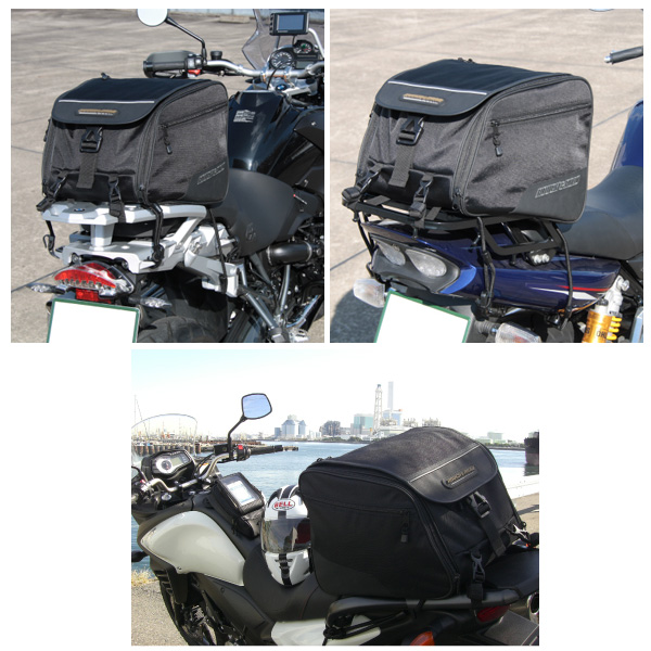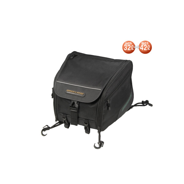 ウィークエンドツーリングから1週間程度のツーリングまでカバーする容量可変のシートバッグです。簡易に積載できるバンジーコード積載としっかり固定したい時のナイロンベルトを使った積載が選べ(もちろん併用可)、車種を選ばず積載ができるのが特徴。サイドは本体の容量アップと別室ポケットの容量アップにわかれているので、荷物の整理がしやすく荷物の増量にも柔軟に対応します。